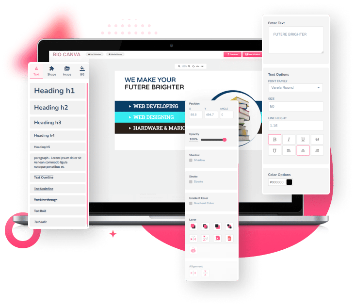 Bio Canva Editor Offers A Variety Of Typography Options To Customize Headings, Paragraphs, And Other Elements With Font Style, Color, Size, And Line Height. You Can Also Add Gradients, Strokes, And Shadows To Make Your Text Stand Out And Captivate Readers. With Typography, You Can Create Engaging And Impactful Content.
